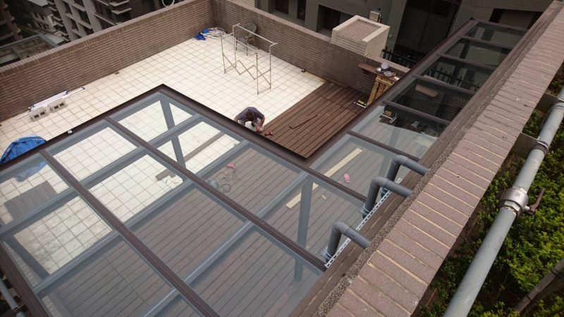 材料:H型鋁鋼構10cm x 10cm(含玻璃安全壓板,集水槽及水管施工)