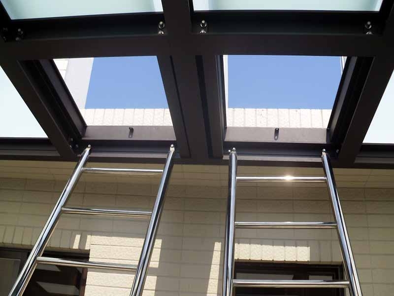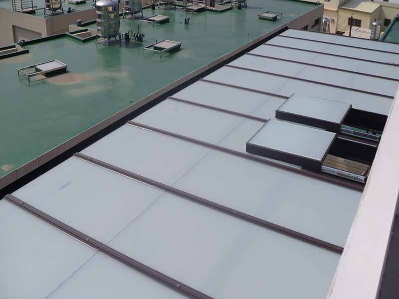 施工項目: H型採光罩 集水槽 咖啡砂色白鐵滑蓋孔 白鐵爬梯 H型鋁鋼構護欄